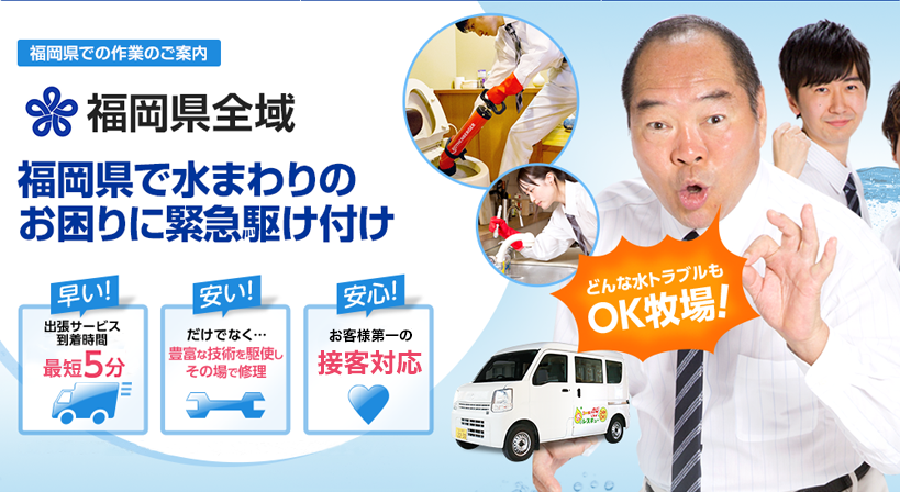 九州で最も人口が多い福岡県では、九州地方の重要な行政機関や、金融機関、報道機関、オフィスが集結しています。また商業施設も数多くあり、福岡空港もあるため、国内外からはさまざまな人が出入りしています。そのため、水まわりのトラブルは日々どこかで発生するほど数が多く、当社では365日態勢で福岡県の水まわりをパトロールしています。中でも福岡県の飲食店では、食がおいしい福岡にグルメ旅行に来る観光客も多く訪れており、たくさんの人を受け入れるお店では、その分水トラブルも発生しやすくなっています。その他にも、観光に来た方がトイレにケータイや指輪を流してしまったなどの事故も相次いで発生しています。
