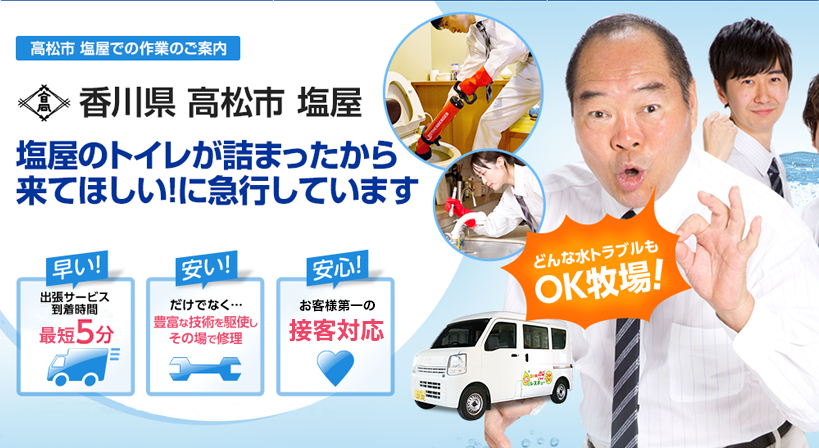 高松市の塩屋エリアの皆様の暮らしを「水道」の面から認定水道技師が支えてまいります。マルヨシセンター 片原町店やマルナカ 通町店・ビッグライフ かがわや西村ジョイ 屋島店の周辺にも、水道の緊急事態が発生したらすぐに認定水道技師がレスキュー!トイレや洗面所・バスルームなど、普段の生活に欠かせない水道のトラブルなら、フリーダイヤルでご相談ください。