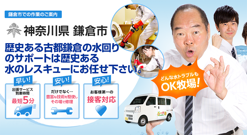 海岸沿いにおしゃれな住宅が建ち並んでいると思えば、一歩裏道に入ると昔ながらの建物が沢山残っているのが鎌倉市の特徴です。建物の新旧に問わず水回りのトラブルは起こるものです。特に鎌倉市は海からの潮風の影響も大きい地域なので、日ごろのメンテナンスが必要なのですが、なかなか行き届かないのが現状の様です。私たち水のレスキューはトラブル時の対応は勿論、日ごろのメンテナンスにも力を入れておりますので、安心してお任せ下さい。