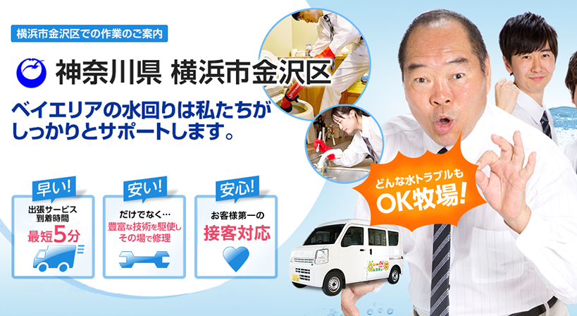 金沢区の幸浦エリアで活動している認定水道技師が、NEWトンカチ・コーナン本牧フロント店やインテリアバイヤー横浜ショールーム・マルキュウ食堂の周辺にも出張中。水道の水漏れなどのトラブルは、その被害の拡大を防止するためにも、素早い対応が求められるものです。フリーダイヤルでご相談いただければ、すぐに腕利きの認定水道技師を派遣いたしますので、いつでもお電話でご依頼ください。