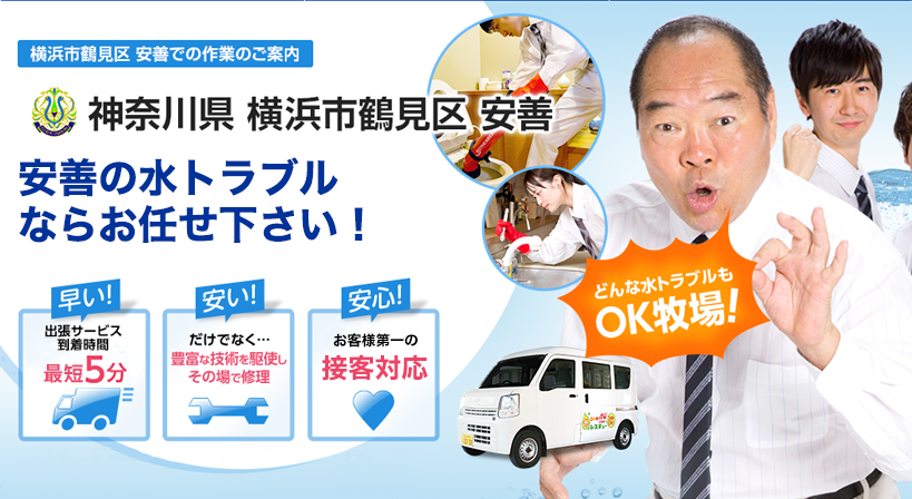 "その沿岸部のほとんどが、シェルルブリカンツジャパン株式会社 横浜事業所やヤマト運輸株式会社 神奈川主管支店など、企業の拠点として利用されている安善エリア。また、安善駅は1日におよそ1,000人程度が利用している、この地域の拠点となっている駅です。 こちらまではお仕事で訪れる方も多い一方で、内陸部には横浜市立寛政中学校などの学校が位置していることでも知られています。なお、安善駅はその名前(あんぜん)という響きから、以前には運転の仕事をされているタクシードライバーやトラック運転手・パイロットなどに人気があったそうでした。ゲン担ぎやご利益を得るために切符が多く売れたこともあったそうで、ユニークな名称が注目を集めたようです。 先日は寛政町公園の近くにある一軒家から「お風呂場の壁付水栓の水漏れがひどいので、修理してほしい・・・」とお電話が。早速認定水道技師が現場へ駆け付けると、こちらの水栓はかなり劣化が激しく進行していました。お客様と相談の上で、新しい壁付水栓を設置させていただくと、そのデザイン性の高さにはかなりご満足いただけていたようです。また、費用もご予算より安く抑えられた点にもご納得いただけていたようでした。水のレスキューでは、このようなバスルームの水栓の取替作業も承っておりますので、お問い合わせはフリーダイヤルまでお待ちしております。