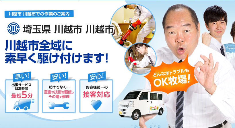 池袋駅と埼玉県を結ぶ東武東上線の中でも主要駅となるのが川越市の川越市駅。池袋駅へのアクセスが良好なのはもちろんですが、すぐ近くに西武新宿線の本川越駅があるため、新宿へのアクセスにも優れています。駅周辺には、埼玉県立川越女子高等学校や富士見中学校などの学校施設が集まっていることもあり、駅前には多くの学生が集います。南には国道16号線、南東部には川越街道が通っていることもあり、電車の便だけではなく、車での移動にも優れた土地です。人気の商業施設ウニクス川越のすぐとなりには、埼玉県 川越地方庁舎があり手続きも便利です。また、その中にはパスポートセンターもあるため、遠出する必要もありません。 当社は、その出張スピードと技術力に磨きをかけ、今現在に至ります。現在では、日本でも屈指の水道業者に成長し、高い技術力、スピードをお客様に提供しています。水のトラブルが起きたときには24時間いつでも出張対応している水のレスキューに一度お問合せください。もちろん見積もりのみのご相談も大歓迎です。