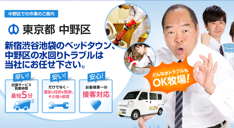 JR中央線が東西に通っているのが中野区です。駅前を中心に沿線回りは住宅や商業施設が密集していています。この様な地域は設備のトラブルも頻発してくるので私たち水のレスキューは予め巡回体制をとっております。これにより依頼のお電話から駆けつけまで極力お待たせせずに修理に取り掛かる事が出来ます。安心してお任せ下さい。